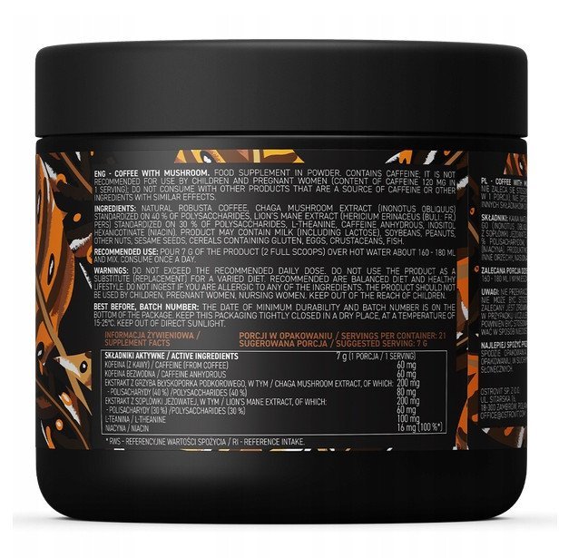 Sudedamosios dalys: Natūrali robustos kava, Chaga grybo (Inonotus obliquus) ekstraktas, Liūto karčių grybo (Hericium erinaceus) ekstraktas, L-teaninas, bevandenis kofeinas, niacinas.